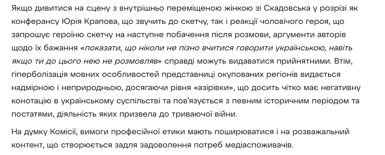 Как сказано в отчете, с одной стороны, "в разрезе как звучащего к скетчу конферанса Юрия Крапова, так и реакции мужского героя, приглашающего героиню скетча на следующее свидание после разговора, аргументы авторов относительно их желания "показать, что никогда не поздно учиться говорить по-украински, даже если ты до этого на нем не разговаривал", действительно могут казаться приемлемыми". С другой, "гиперболизация языковых особенностей представительницы оккупированных регионов кажется чрезмерной и неестественной, достигая уровня "азировки", что довольно четко имеет негативную коннотацию в украинском обществе и связывается с определенным историческим периодом и фигурами, деятельность которых привела к продолжающейся войне".