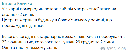 В больнице скончался один из пострадавших во время ракетной атаки по Киеву 2 января. Это третья жертва в пострадавшем от обстрела доме в Соломенском районе столицы.