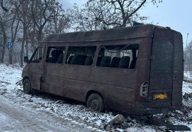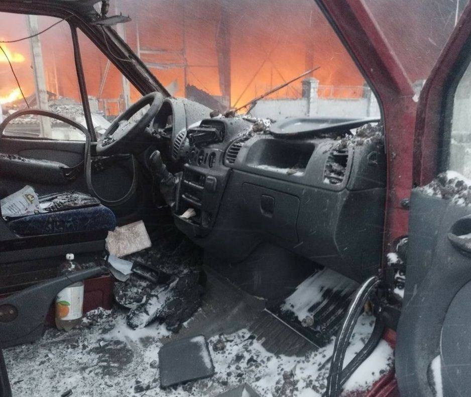 В Новомосковске пострадала маршрутка с людьми. Она перевернулась от ударной волны. Всем пассажирам и водителю удалось выбраться. На фото на фоне маршрутки горит какой-то объект.