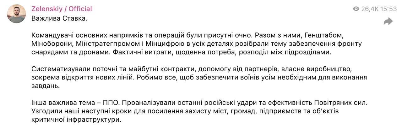 Президент Украины провел заседание Ставки верховного главнокомандующего, на котором обсуждали обеспечение потребностей фронта и усиление ПВО.