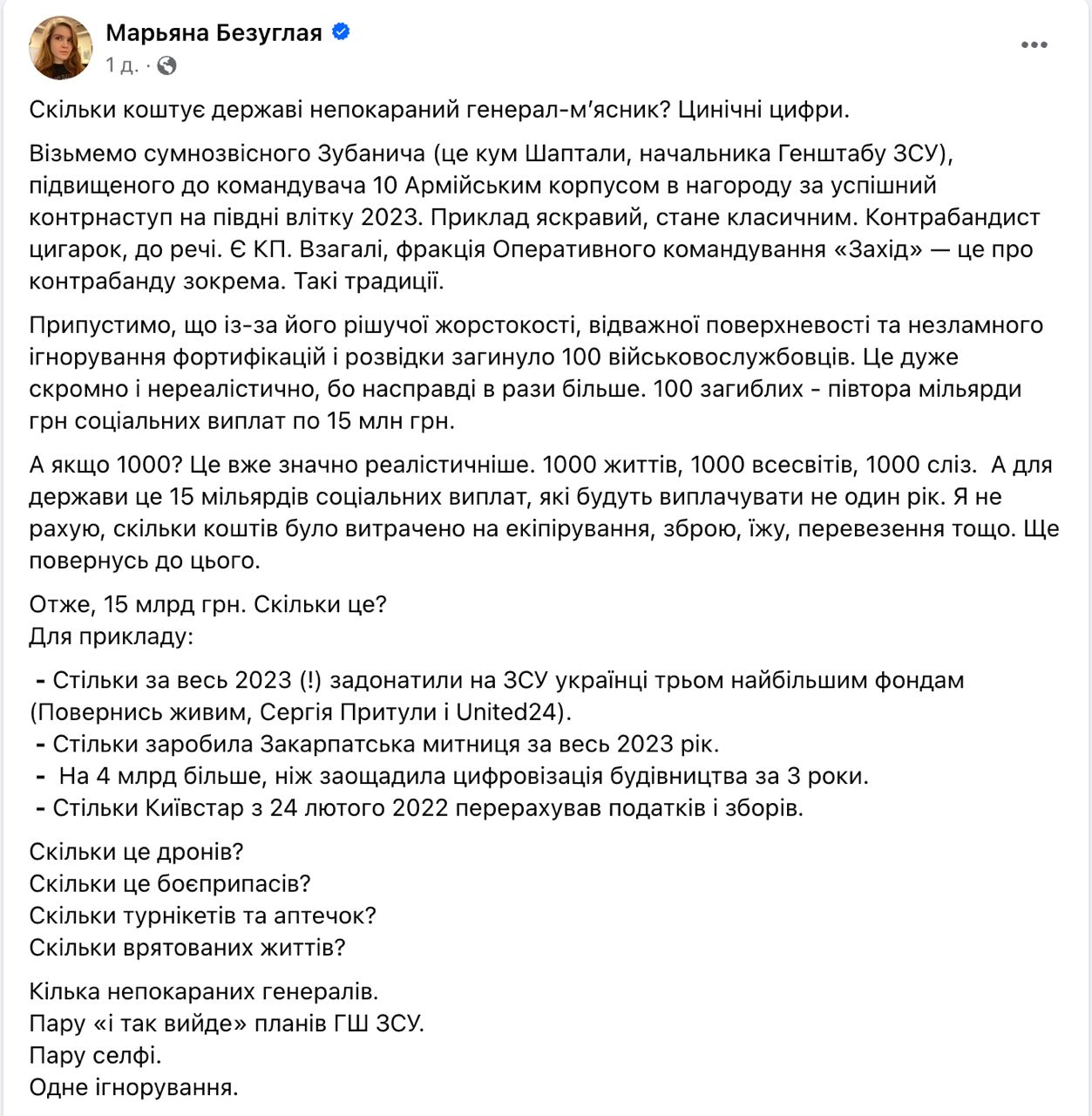 "Сколько стоит государству ненаказанный генерал-мясник? Циничные цифры. Возьмем печально известного Зубанича (это кум Шапталы, начальника Генштаба ВСУ), повышенного до командующего 10 Армейским корпусом в награду за успешное контрнаступление на юге летом 2023. Контрабандист сигарет, кстати. Есть УП (уголовное производство - Ред.), - пишет Безуглая.