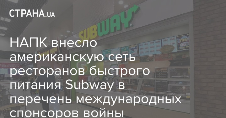 Национальное агентство по вопросам предотвращения коррупции (НАПК) внесло американскую сеть ресторанов быстрого питания Subway в перечень международных спонсоров войны.