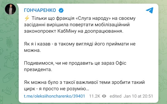 А вскоре и лидер фракции "Слуги народа" Давид Арахамия опроверг пост Гончаренко.