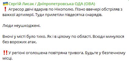 07.35 Поздно вечером россияне дважды ударили из тяжелой артиллерии по Никополю в Днепропетровской области. Обошлось без пострадавших.