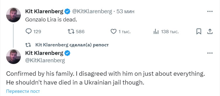 "Гонсало Лира-старший рассказал, что его 55-летний сын умер в украинской тюрьме", - написал Такер Карлсон в Х.