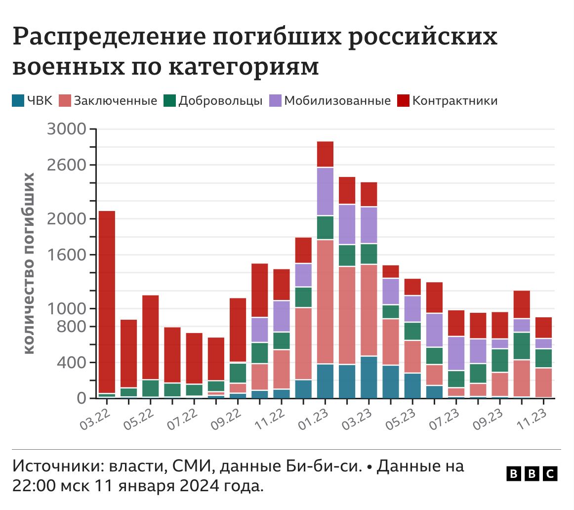 Во-первых, рекордно большие потери российские войска несли в первые три месяца 2023 года. Это время, когда ЧВК "Вагнер" штурмовала Бахмут. Судя по структуре потерь, на "вагнеровцев" (если брать и наемников ЧВК, и завербованных заключённых) приходилось более половины всех убитых россиян в Украине. То есть потери "вагнеровцев" около Бахмута превышали в те месяцы на всех остальных участках фронта у россиян. Собственно, свои огромные потери, уровень которых превосходил потери Красной Армии во Вторую мировую, признают и сами "вагнеровцы".