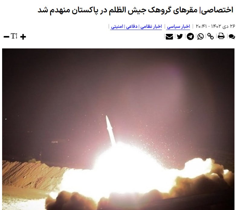 Корпус стражей исламской революции Ирана (КСИР), входящий в Вооруженные силы Ирана, нанес ракетный удар по штабам террористической группировки "Джайш аль-Залм" в Пакистане.