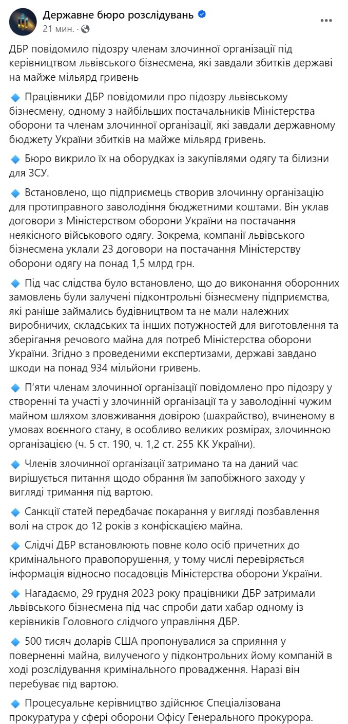 Новое дело касается возможной коррупции на оборонных тендерах. Ущерб при закупке у него государством одежды и белья для ВСУ оценивается в почти миллиард гривен.