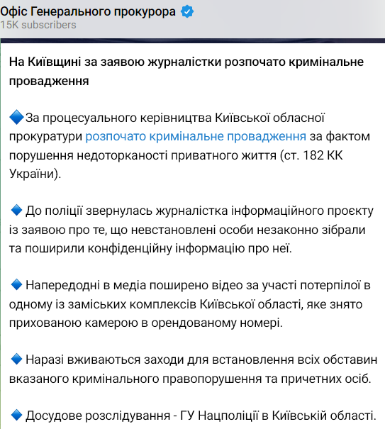 "При процессуальном руководстве Киевской областной прокуратуры начато уголовное производство по факту нарушения неприкосновенности частной жизни (ст. 182 УК Украины). В полицию обратилась журналистка информационного проекта с заявлением о том, что неустановленные лица незаконно собрали и распространили конфиденциальную информацию о ней. Накануне в медиа распространено видео с участием потерпевшей в одном из загородных комплексов Киевской области, которое снято скрытой камерой в арендованном номере", - говорится в сообщении.