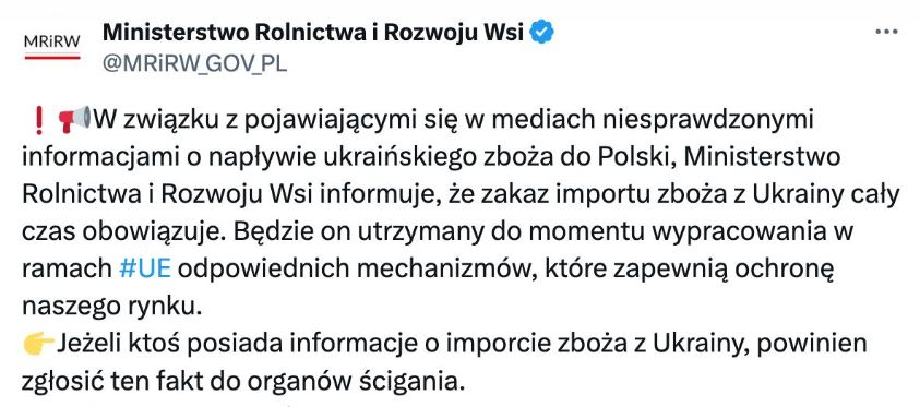 "Запрет на импорт зерна из Украины продолжает действовать. Он сохранится до тех пор, пока в рамках ЕС не будут разработаны соответствующие механизмы, которые обеспечат защиту нашего рынка", -  говорится в сообщении размещенном в Х.