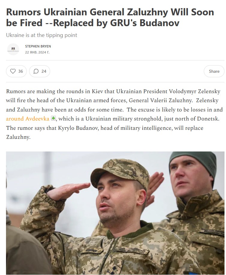 В контексте Авдеевки уже неделю в Сети расходится ничем не подтвержденный слух, что Зеленский на фоне проблем в Авдеевке якобы хочет уволить главкома ВСУ Залужного и поставить на его место главу ГУР Буданова.