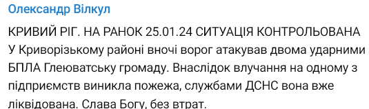 "В Криворожском районе ночью враг атаковал двумя ударными БПЛА Глеюватскую общину. В результате попадания на одном из предприятий возник пожар, службами ГСЧС он уже ликвидирован", - говорится в сообщении.