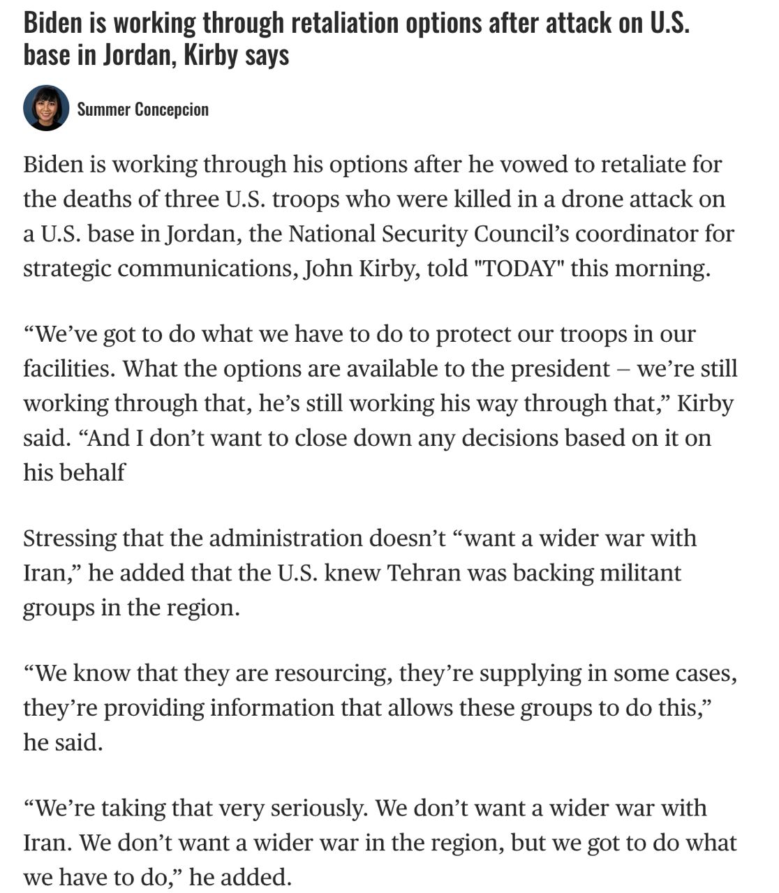 Тем временем координатор стратегических коммуникаций Совета нацбезопасности США Джон Кирби заявил, что США не хотят "более широкой войны с Ираном", но должны ответить на гибель трех американских военнослужащих во время удара по базе.