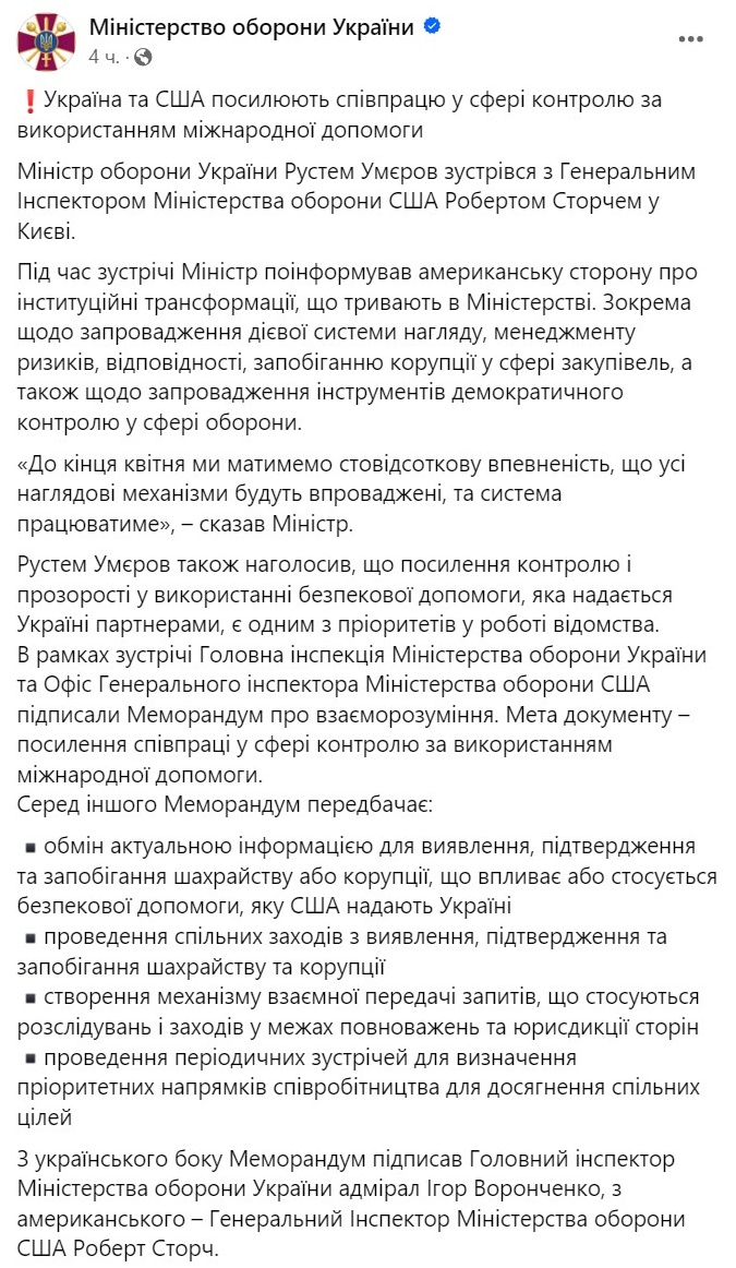 Во время встречи с генеральным инспектором Минобороны США Робертом Сторчем министр обороны Рустем Умеров отметил, что усиление контроля и прозрачности в использовании помощи, предоставляемой Украине партнерами, является одним из приоритетов в работе ведомства.