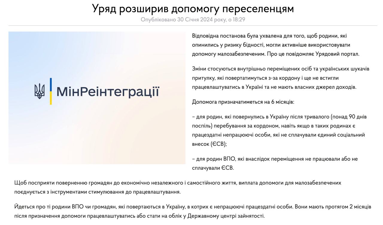 Выплаты малообеспеченным теперь будут получать также внутренне перемещенные лица (ВПЛ) без работы и семьи, вернувшиеся из-за границы.