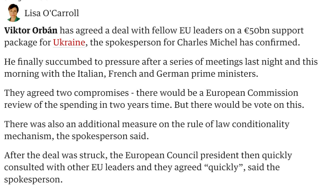 В то же время Reuters со ссылкой на источники сообщает, что ЕС не обещал Венгрии выделить ни одного замороженного миллиарда евро из фондов ЕС, а соглашение включает лишь ежегодное обсуждение пакета помощи Украине и возможность его пересмотра через два года «в случае необходимости», но без права вето для Будапешта.