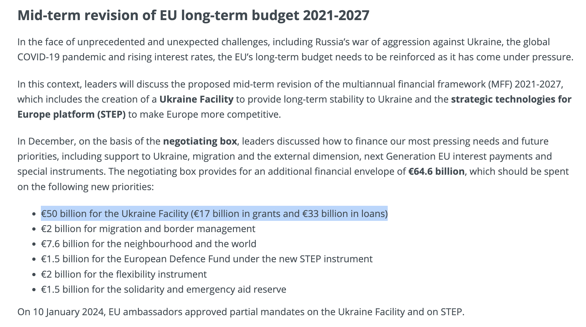 Евросоюз на саммите утвердил выделение 50 миллиардов евро помощи Украине.