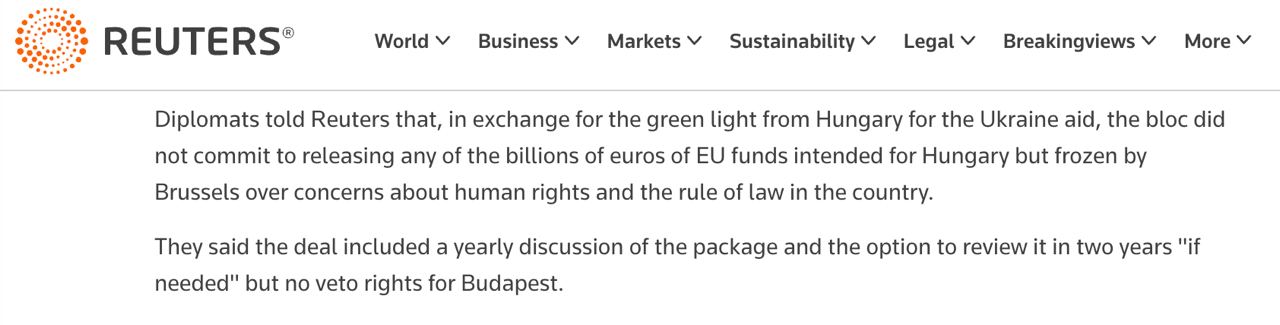 По данным агентства, в ЕС заявили лишь, что сегодняшнее соглашение включает ежегодное обсуждение пакета помощи Украине и возможность его пересмотра через два года "в случае необходимости", но без права вето для Будапешта.
