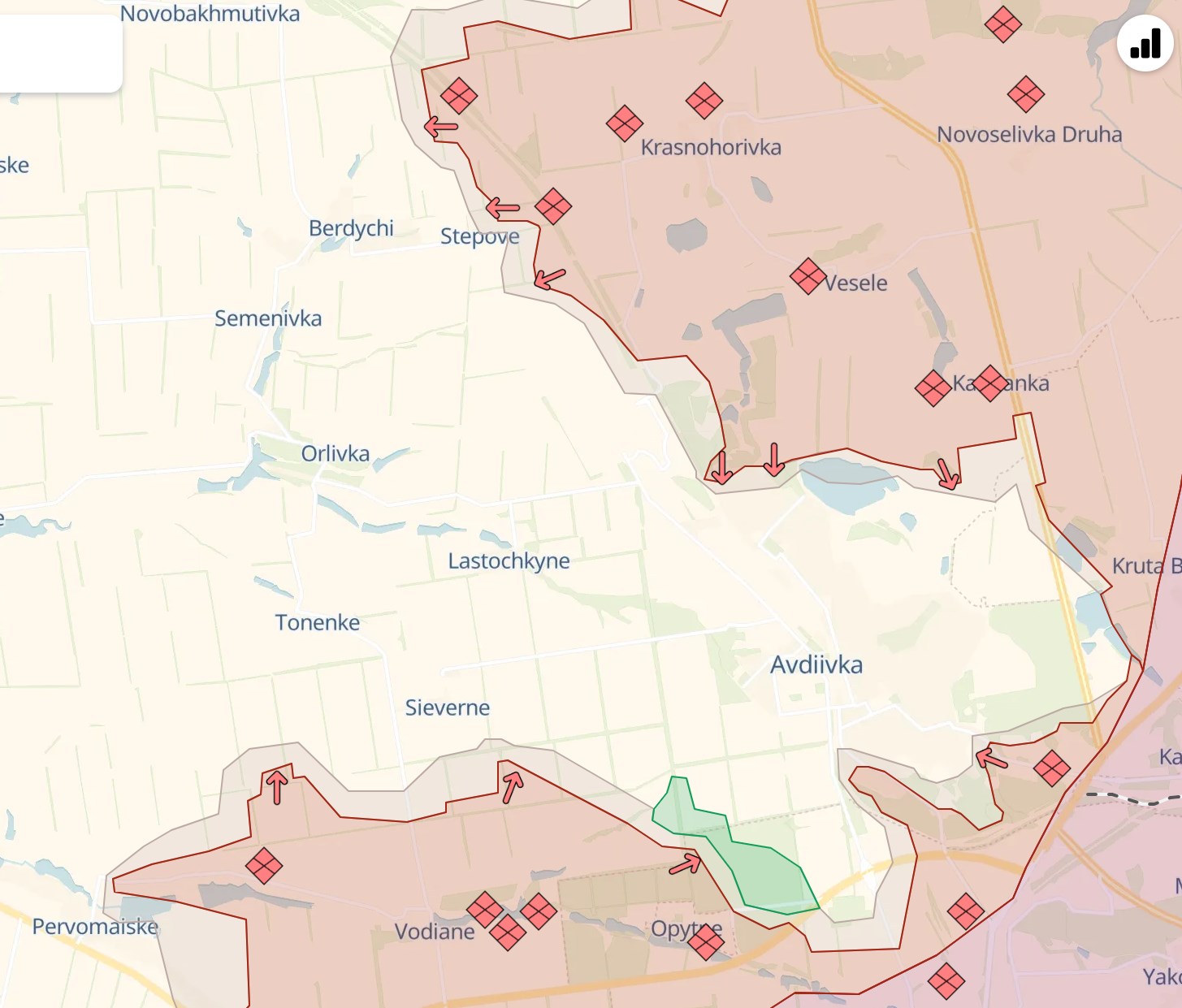 Также российские паблики сообщают, что войска РФ приблизились к Донецкой фильтровальной станции к северо-востоку от Авдеевки и начали бои на подступах к объекту. Другие источники этого не подтверждали.