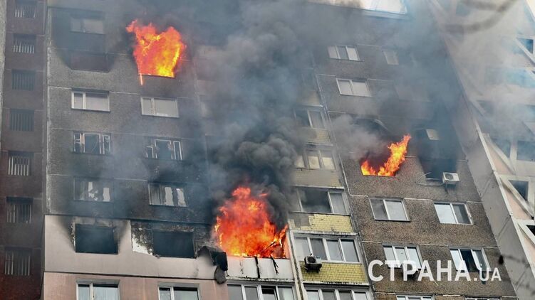 В Киеве в Голосеевском районе после ракетной атаки горит многоквартирный дом.