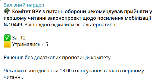 Парламентский комитет по обороне рекомендовал принять в первом чтении правительственный законопроект о мобилизации. И, соответственно, отклонить все альтернативные.