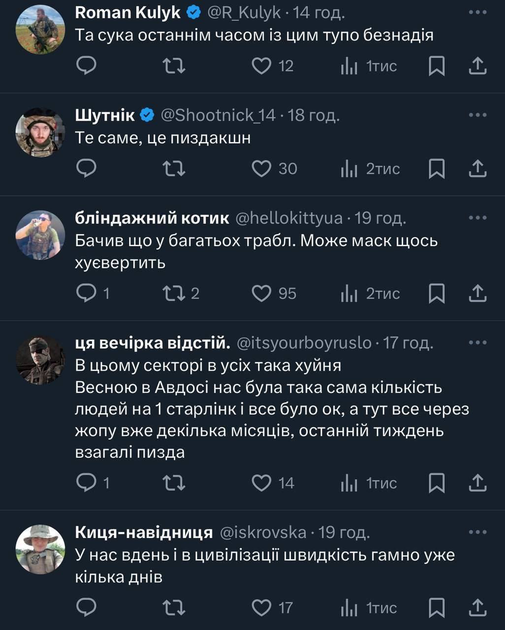 В то же время украинские военные жалуются, что их интернет от Starlink стал очень медленный - буквально 0,3 мб\с. По их словам, проблемы наблюдаются уже несколько месяцев, а в последнюю неделю особенно сильно.