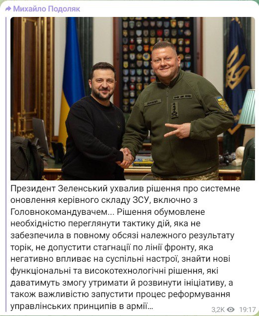 Но также как и Зеленский не написал прямо, что Залужный отправлен в отставку.