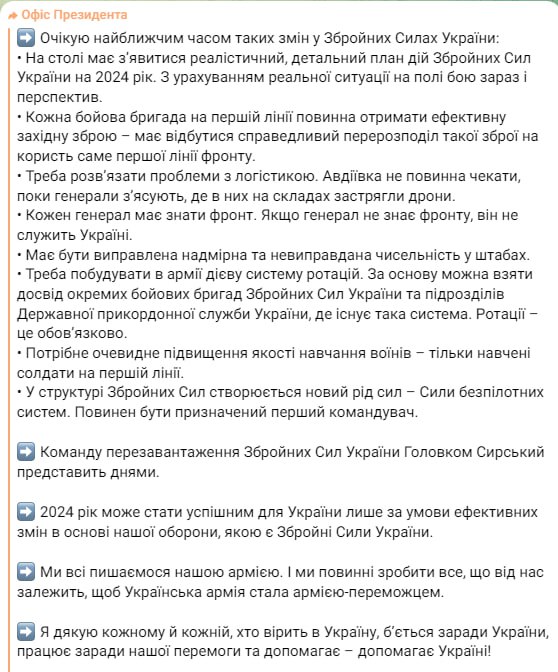 1. На столе должен появиться "реалистичный, подробный план действий ВСУ на 2024 год". С учетом реальной ситуации на поле боя сейчас и перспектив.