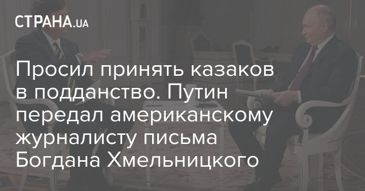 Президент России Владимир Путин в интервью американскому журналисту Такеру Карлсону не удержался от экскурса в историю и передал папку с архивными документами - письмами Богдана Хмельницкого в Москву, который просил царя принять казаков в свое подданство.