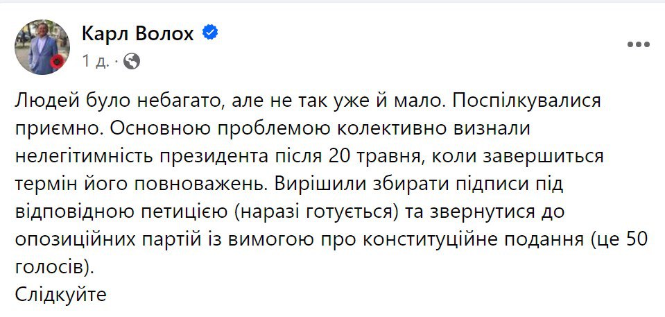 Вопрос легитимности президента был поднят Волохом в посте по итогам организованной им акции на Майдане против отставки Валерия Залужного с поста главкома ВСУ.