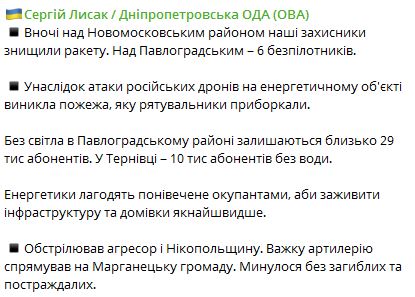 Ночью над Новомосковским районом Днепропетровской области уничтожили ракету. Над Павлоградским – 6 беспилотников.