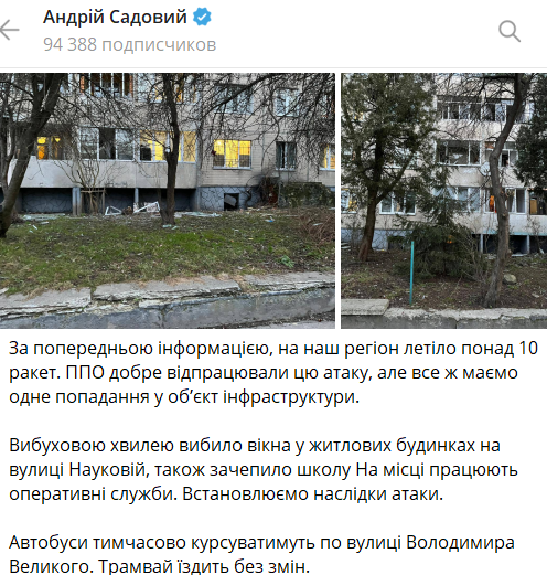 Во Львове мэр Андрей Садовый подтвердил прилет по объекту инфраструктуры во время ракетной атаки РФ утром 15 февраля.