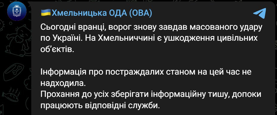 "Сегодня утром враг вновь нанес массированный удар по Украине. На Хмельниччине есть повреждения гражданских объектов", - сообщили в ОВА.