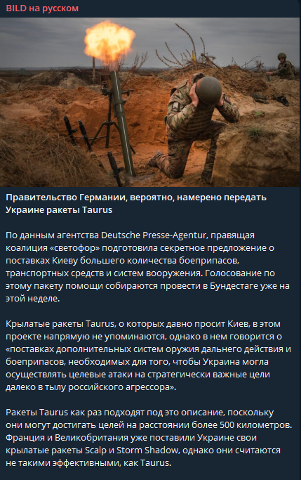 Также газета The New York Times сообщала, что на Германию оказывается давление с целью заставить ее поставить Украине ракеты большой дальности Taurus, тем более, что Великобритания и Франция уже предоставили Киеву аналогичное вооружение.