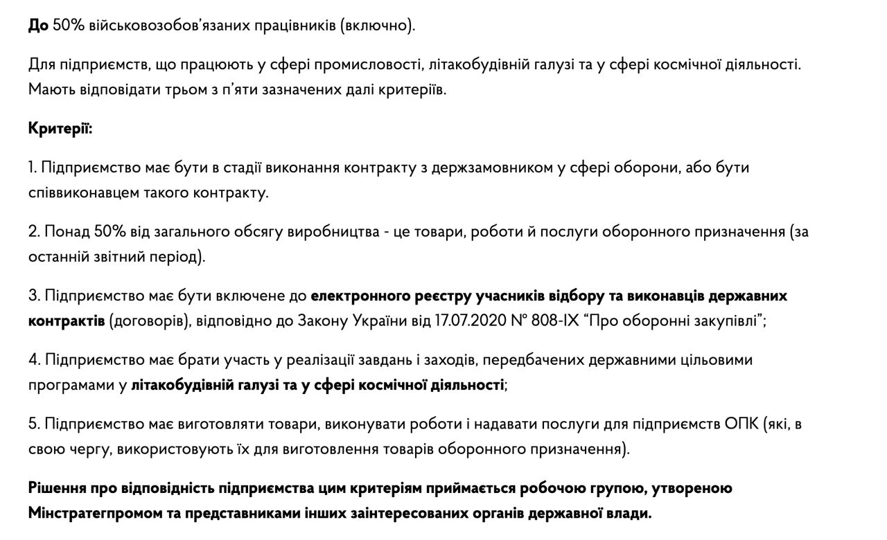 До половины работников смогут забронировать предприятия, работающие в сфере промышленности, самолетостроительной отрасли и в сфере космической деятельности, и соответствующие 3 из 5 критериев, приведенные на скриншоте.