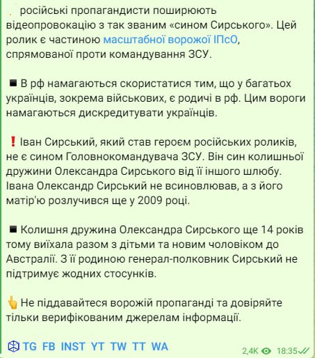 Центр противодействия информации опроверг публикации российских СМИ о том, что поддерживающий политику Владимира Путина Иван Сырский является приемным сыном главнокомандующего ВСУ Александра Сырского.