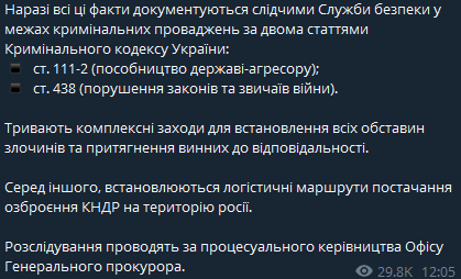 По данным следствия, российские военные использовали более 20 северокорейских оружейных систем против Украины. Служба безопасности Украины подчеркнула, что как минимум 24 мирных жителя погибли и более ста граждан получили тяжелые ранения в результате атак.