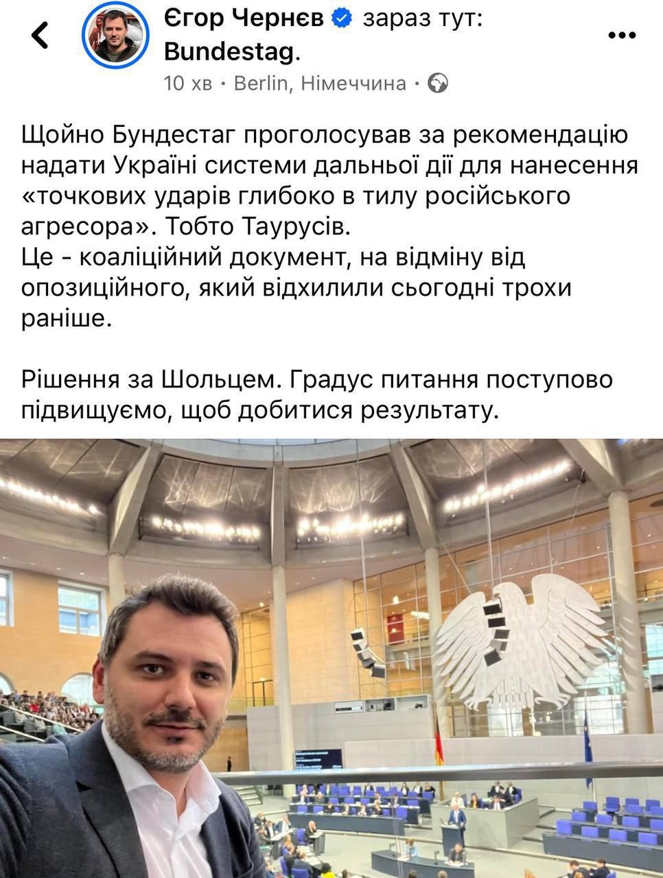 В свою очередь глава постоянной делегации Украины в ПА НАТО Егор Чернев сообщил, что Бундестаг проголосовал за рекомендацию предоставить Украине системы дальнего действия для нанесения "точечных ударов глубоко в тылу российского агрессора".