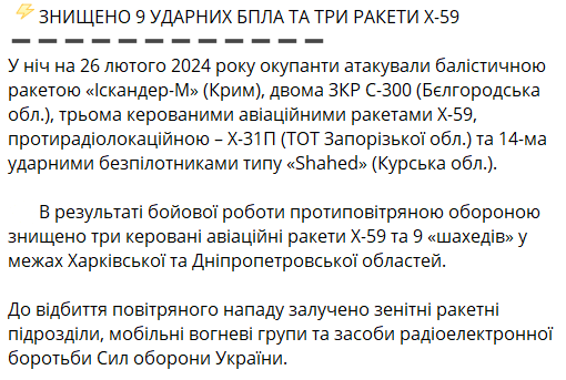 Ночью 26 февраля Украину атаковали 14 беспилотников "Шахедов", из которых девять удалось сбить. Также были сбиты три ракеты Х-59.