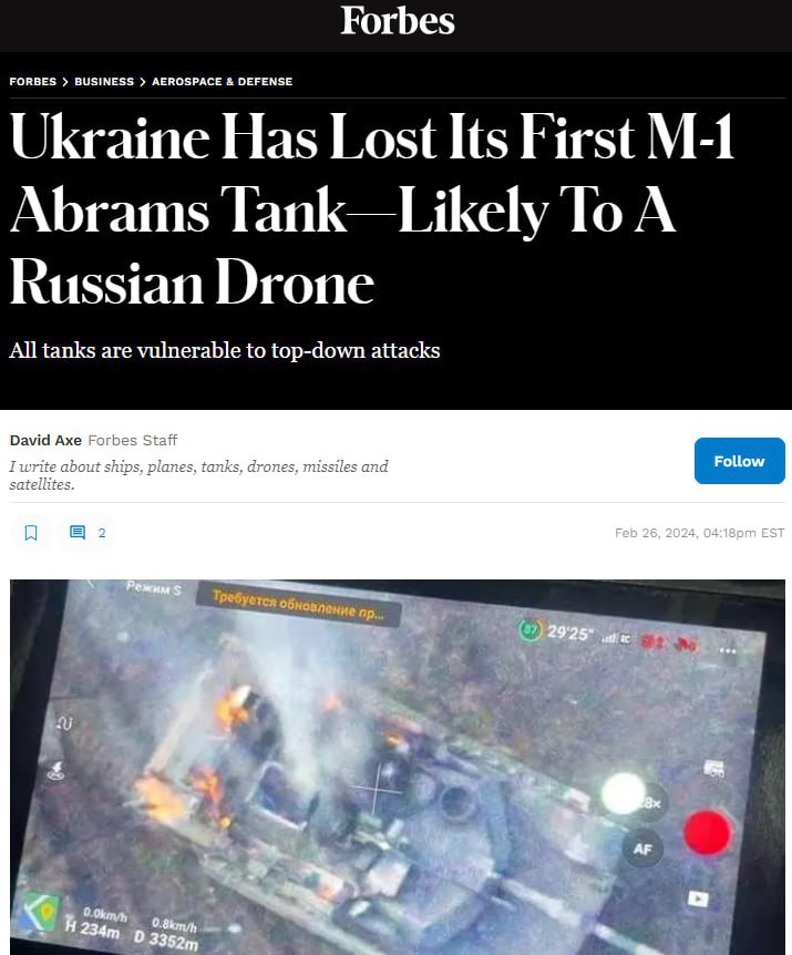 Напомним, 23 февраля 47-я бригада Вооружённых сил Украины показала американский танк Abrams на фронте.