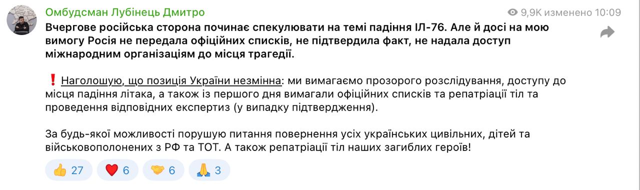 Омбудсмен Дмитрий Лубинец прокомментировал заявление РФ о готовности передать Украине останки украинских пленных, погибших, как утверждает Москва, при крушении Ил-76 в Белгородской области.