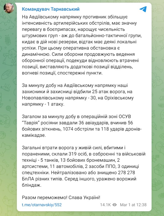 "На авдеевском направлении противник увеличивает интенсивность артиллерийских обстрелов, имеет значительное преимущество в боеприпасах, наращивает численность штурмовых групп - вплоть до батальонно-тактической группы, бросает в действие новые резервы, имея некоторые локальные успехи. При этом оперативная обстановка динамична. Силы обороны продолжают ведение оборонной операции, иногда восстанавливают утраченные позиции, выставляют дополнительные позиции отделений, огневые позиции, наблюдательные пункты", - сказано в посте командующего.