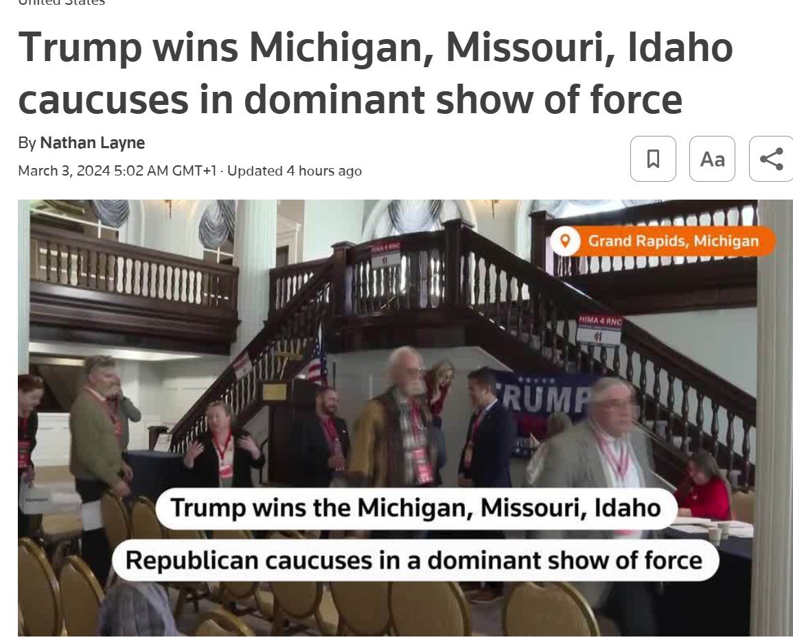 В Мичигане, который считался важным штатом, поскольку республиканцы там выглядели расколотыми, Трамп выиграл почти 98% поддержки: 1575 голосов - против 36 за его конкурентку Никки Хейли.