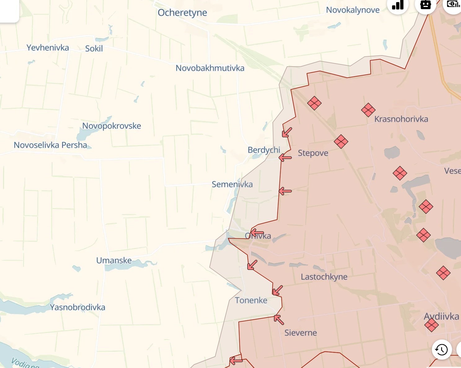 Военные аналитики в РФ считают, что Украина, удерживая нынешние позиции по линии Бердычи - Орловка - Тоненькое строит западнее укрепрайон по линии Семёновка - Яснобородовка - Уманское - Новопокровка.