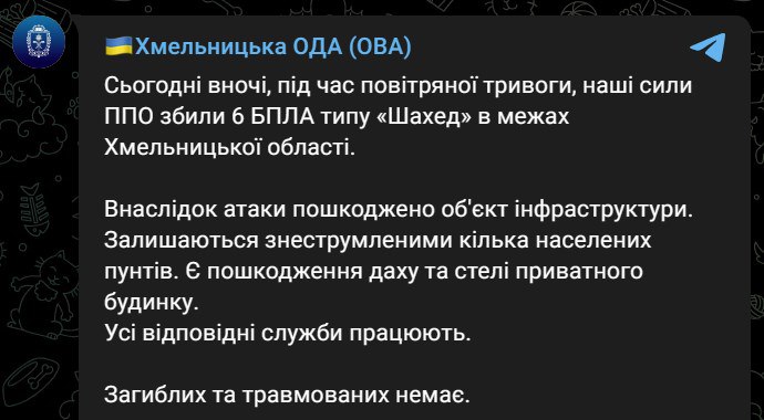 08.52 Ночью "Шахед" ударил по объекту инфраструктуры в Хмельницкой области. Часть населенных пунктов региона обесточены.
