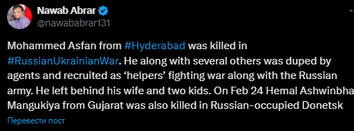 "Мохаммед Асфан погиб на российско-украинской войне. Он вместе с несколькими другими был обманут агентами и завербован как помощник, чтобы воевать вместе с российской армией", – написал Абрар.