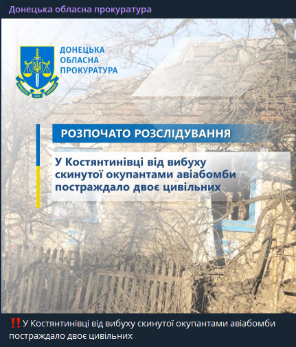 Сегодня в Константиновке от взрыва российской авиабомбы пострадали два человека. Они находились в своих домах и получили повреждения вследствие разлета осколков разбитого стекла.