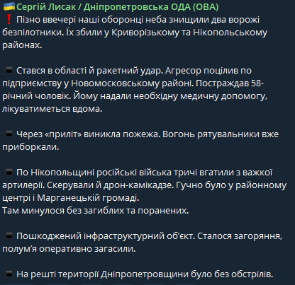 Кроме того, поздно вечером наши защитники уничтожили два вражеских беспилотника. Их сбили в Криворожском и Никопольском районах.