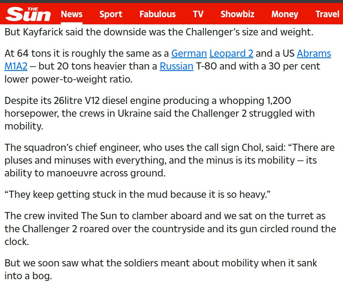 Журналист The Sun убедился в этом лично: когда он сел в танк и проехался в нем, машина "увязла в трясине".