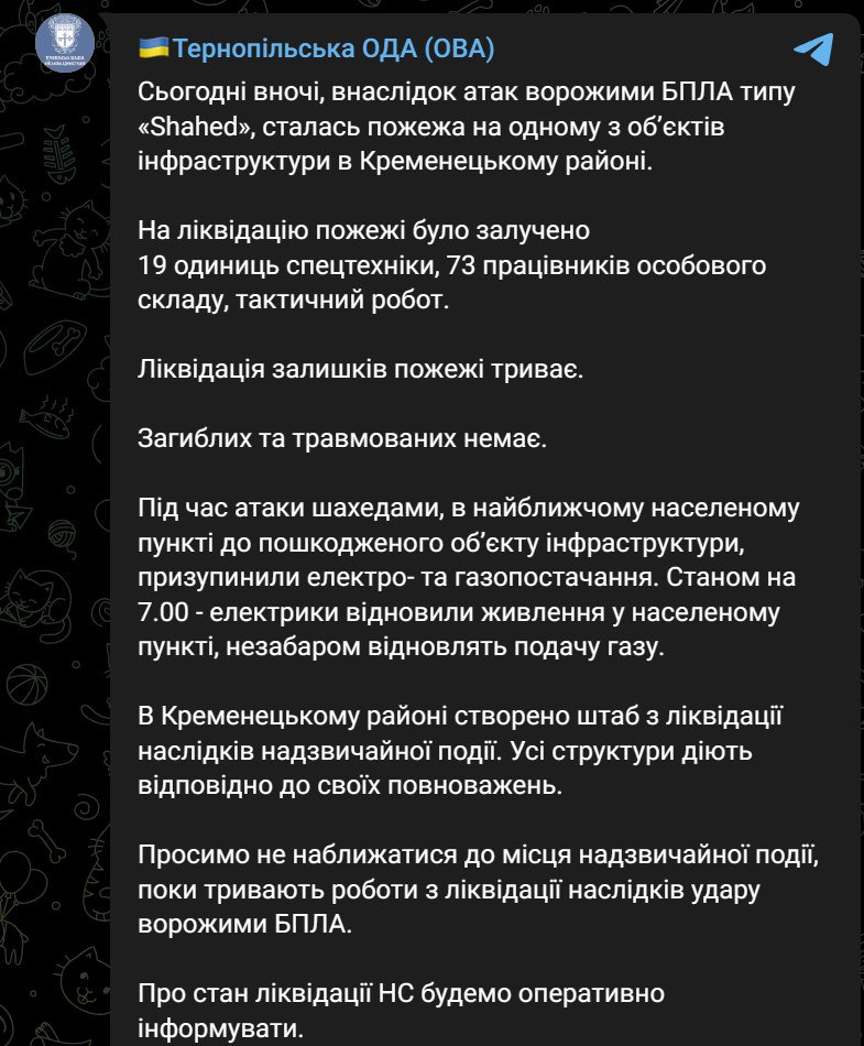 09.55 После ночного удара "Шахедов" горит объект инфраструктуры в Кременецком районе Тернопольской области, сообщает ОВА.